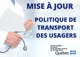 Baie-Comeau, le 6 janvier 2023 - Le Centre intégré de santé et de services sociaux (CISSS) de la Côte‑Nord avise la population que la version révisée de la Politique de transport des usagers est maintenant en vigueur, et ce, depuis le 1er janvier 2023.