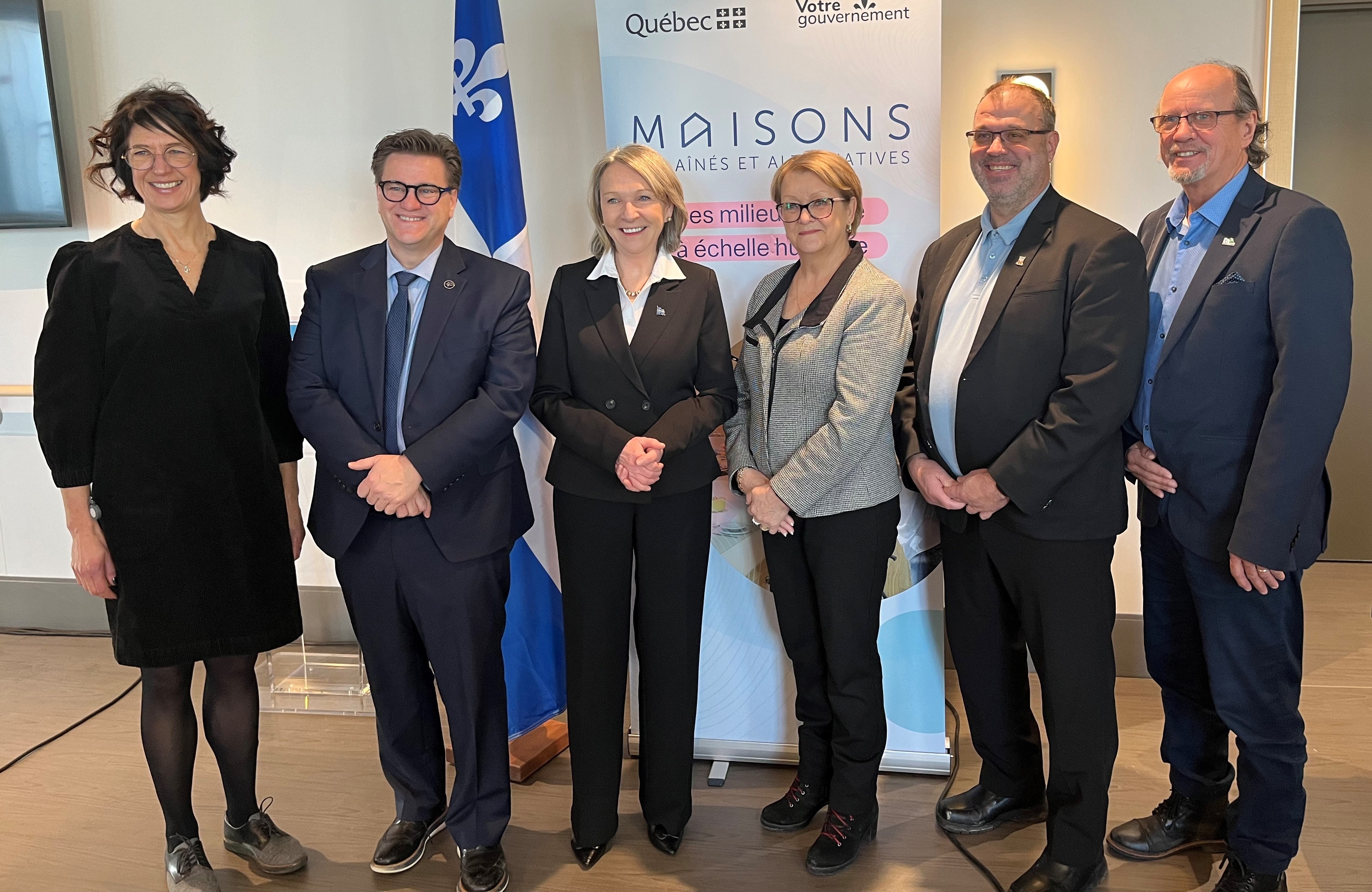 Photo : Nathalie Castilloux, présidente-directrice générale par intérim du CISSS de la Côte-Nord, Yves Montigny, député de René-Lévesque, Sonia Bélanger, ministre responsable des Aînés et ministre déléguée à la Santé, Micheline Anctil, présidente de la Table de concertation des aînés de la Côte-Nord, Michel Desbiens, maire de Baie-Comeau, et Julien Normand, préfet suppléant de la MRC de Manicouagan.