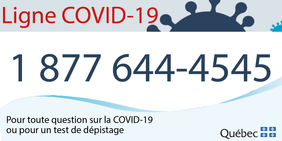 Si la COVID‑19 vous inquiète ou si vous présentez des symptômes s'apparentant à la COVID-19, composez le 1 877 644-4545 (réponses à vos questions sur la COVID-19 et références pour prendre un rendez-vous de dépistage).