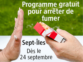 Le Centre intégré de santé et de services sociaux (CISSS) de la Côte‑Nord offrira gratuitement, dès le 24 septembre à Sept-Îles, un programme de cessation tabagique basé sur la démarche « Oui, J'arrête ». D'une durée de huit semaines, il propose une démarche globale et réaliste pouvant aider à trouver les causes du tabagisme, afin de prendre des décisions éclairées et de poser des actions satisfaisantes pour cesser de fumer tout en étant accompagné par une équipe de professionnels.
