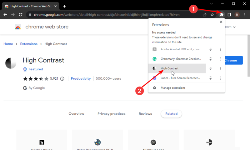 6. Cliquez sur l'icône Extensions (1) à côté de la barre d'adresse et sélectionnez Contraste élevé (High Contrast) (2) pour l'activer.