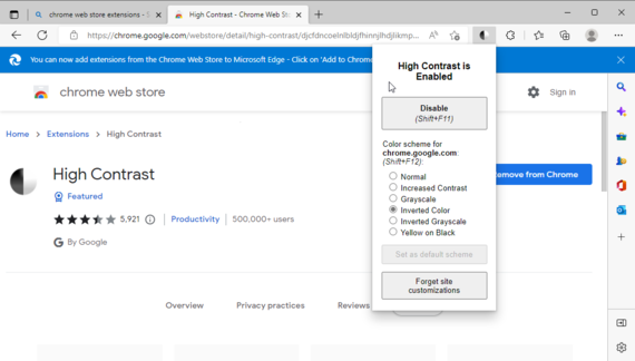 Edge, un navigateur basé sur Chromium, peut utiliser les extensions du Chrome Web Store. Par conséquent, avec cette extension installée, vous pouvez définir le contraste élevé à votre goût sur votre navigateur.