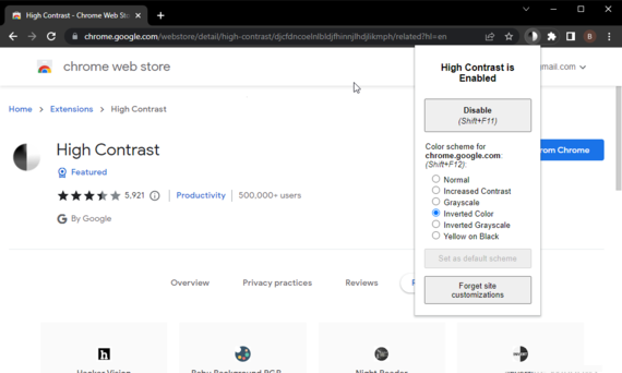 L'extension  Contraste élevé (High Contrast) est recommandée pour augmenter le contraste sur Chrome. Une fois l'extension installée, le réglage du contraste de votre navigateur vous facilitera la tâche.