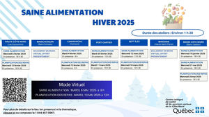 - Trois par des nutritionnistes : Grâce à des conseils pratiques et des exemples concrets, vous repartirez avec les outils pour faire des choix alimentaires éclairés tout en gagnant du temps et de l'argent pour la préparation de vos repas. Les ateliers porteront sur les bases d'une alimentation saine et équilibrée. Les rencontres sont en présence et certains territoires en téléconsultation.