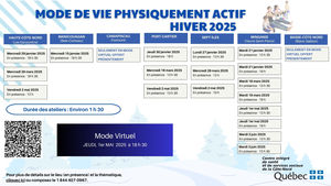 - Quatre par des kinésiologues : Trois rencontres sur quatre se dérouleront sous forme de marche à l'extérieur, combinant théorie et pratique. Une rencontre portera sur un atelier de musculation avec un programme à reproduire à la maison. Les participants apprendront à intégrer l'activité physique dans leur quotidien à leur rythme. Une condition minimale : être capable de marcher 10 minutes en continu pour participer pleinement au programme.